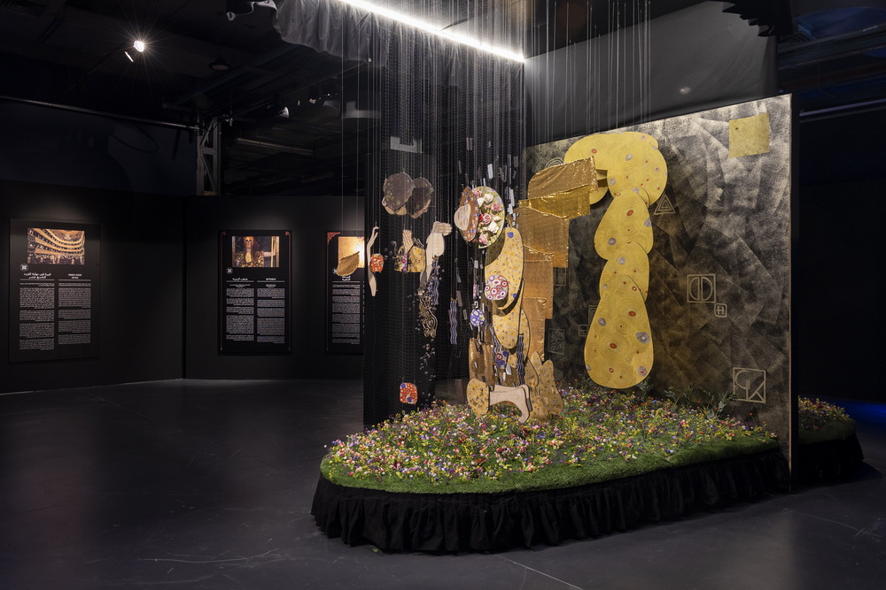 В свой так называемый «золотой» период, Климт использовал золотую фольгу, золотую краску, серебро, платину, сусальное золото. Контраст между нарисованными краской телами и золотым декором притягивает взгляд. На этой выставке-путешествии по виртуальной реальности эти чудесные полотна скользят по стенам, полу и потолку, создавая эффект 360°, соединяя декоративность с реализмом. Путешествии в первую очередь для зрителей, во вторую для самой выставки, уже показывавшейся в Мадриде, Нью-Йорке, Амстердаме, Париже и Риме.